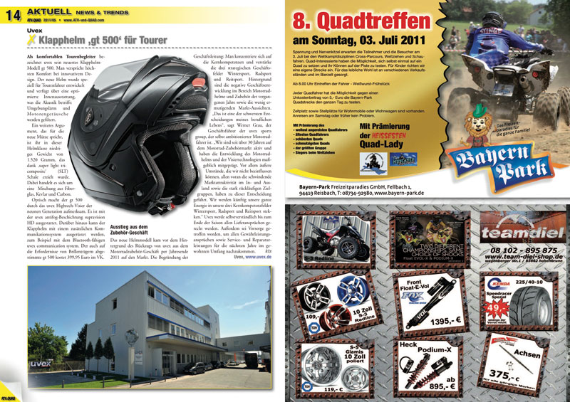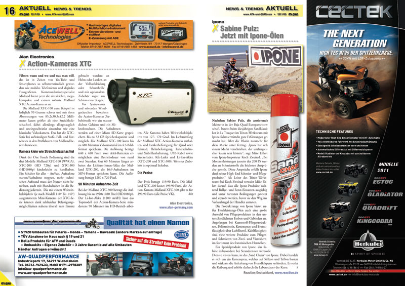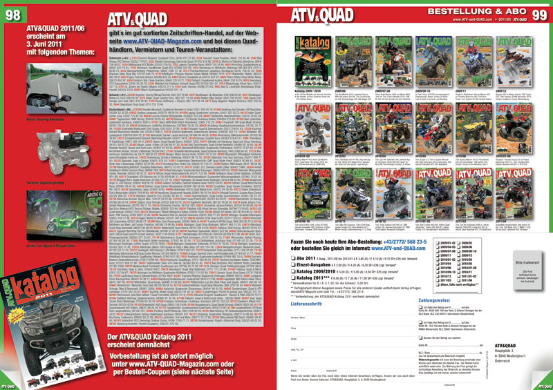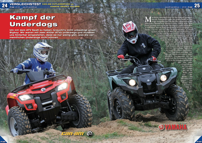 Montag 2. Mai 2011 von imo Kommentar schreibenAb 6. Mai gibt’s die folgende Ausgabe ATV&QUAD 2011/05 am Kiosk und bei vielen freundlichen Quadhändlern. Im Mittelpunkt stehen der Vergleichstest der brandneuen Yamaha Grizzly 450 mit der Can-Am Outlander 400 sowie der Fahrbericht der Triton Reactor 450…