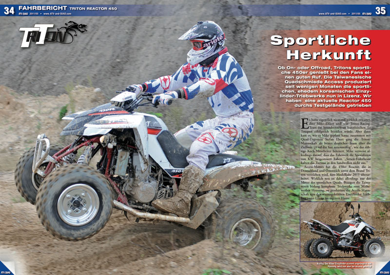 Sportliche Herkunft: Ob On- oder Offroad, Tritons sportliche 450er genießt bei den Fans einen guten Ruf. Die Taiwanesische Quadschmiede Access produziert seit wenigen Monaten die sportlichen, ehedem koreanischen Einzylinder-Triebwerke nun in Lizenz. Wir haben eine aktuelle Reactor 450 durchs Testgelände getrieben… Seite 34