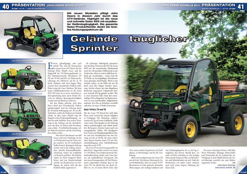 Geländetauglicher Sprinter: Mit neuen Modellen pflügt John Deere in diesem Jahr durch das UTV-Gelände. Highlight ist die neue und schnelle Gator 855 mit exzellenter Geländegängigkeit. Die gesamte Gator-Produktfamilie deckt ein breites Nutzungsspektrum ab… Seite 40-41