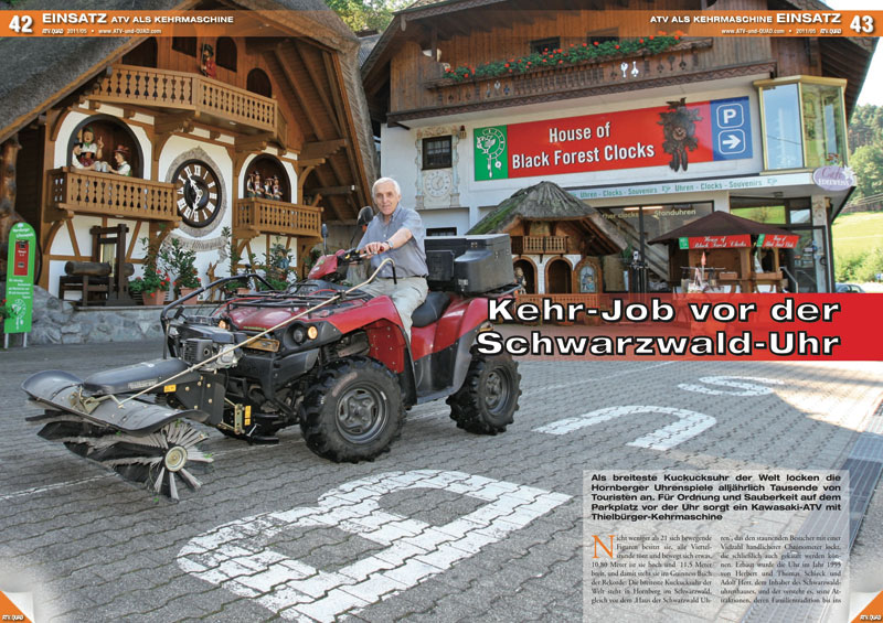 Kehr-Job vor der Schwarzwald-Uhr: Als breiteste Kuckucksuhr der Welt locken die Hornberger Uhrenspiele alljährlich Tausende von Touristen an. Für Ordnung und Sauberkeit auf dem Parkplatz vor der Uhr sorgt ein Kawasaki-ATV mit Thielbürger-Kehrmaschine… Seite 42-45