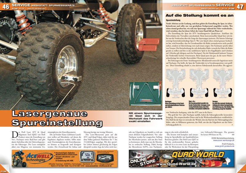 Auf die Stellung kommt es an: Die Einstellung der Spur der ATV- beziehungsweise Quadachsen beinflusst das Fahrverhalten des Vierradlers entscheidend. Beim konventionellen Quad lässt sich dabei nur die Vorderachse über die Länge der Spurstangen justieren… Seite 46-47