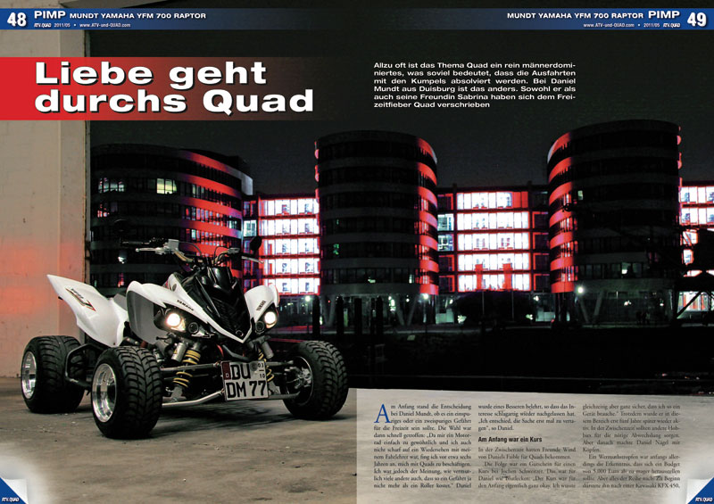 Liebe geht durchs Quad: Allzu oft ist das Thema Quad ein rein männerdominiertes, was soviel bedeutet, dass die Ausfahrten mit den Kumpels absolviert werden. Bei Daniel Mundt aus Duisburg ist das anders. Sowohl er als auch seine Freundin Sabrina haben sich dem Freizeitfieber Quad verschrieben… Seite 48-53