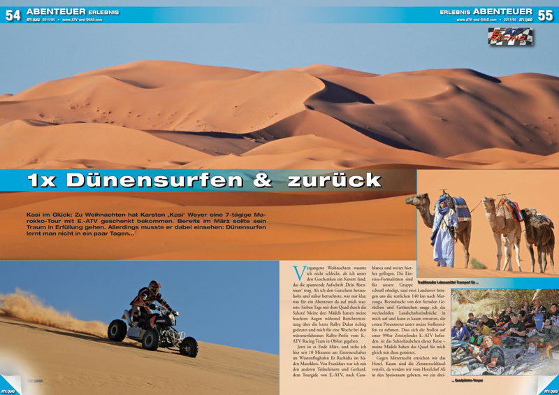 Kasi im Glück: Zu Weihnachten hat Karsten ‚Kasi‘ Weyer eine 7-tägige Marokko-Tour mit E.-ATV geschenkt bekommen. Bereits im März sollte sein Traum in Erfüllung gehen. Allerdings musste er dabei einzusehen: Dünen Surfen lernt man nicht in ein paar Tagen… Seite 54-55