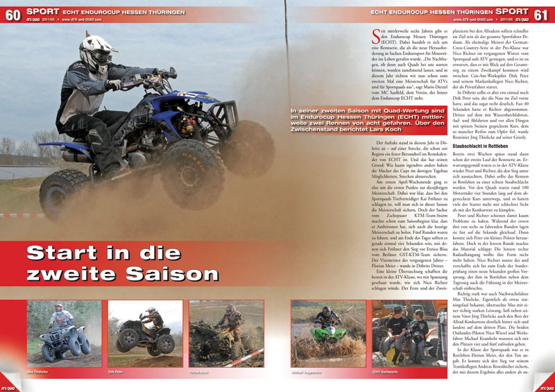Start in die zweite Quad Saison: In seiner zweiten Saison mit Quad-Wertung sind im Endurocup Hessen Thüringen (ECHT) mittlerweile zwei Rennen von acht gefahren. Über den Zwischenstand berichtet Lars Koch… Seite 60-62