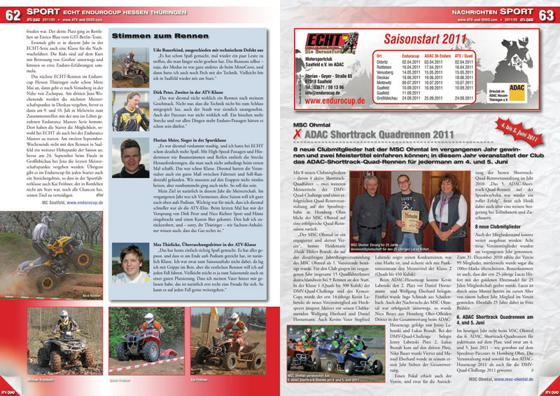ADAC Shorttrack Quadrennen 2011: 8 neue Clubmitglieder hat der MSC Ohmtal im vergangenen Jahr gewinnen und zwei Meistertitel einfahren können; in diesem Jahr veranstaltet der Club das ADAC-Shorttrack-Quad-Rennen für jedermann am 4. und 5. Juni… Seite 63