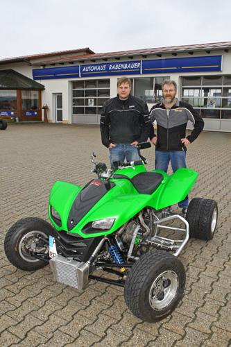 In weiterer Folge plant das Rabenbauer-Team, mit der Kompressor KFX 700 eine Alternative zu Vierzylinder-Umbauten anzubieten. Abgesehen davon, dass die Mehrleistung bei der Kompressor-Lösung bereits bei 6.800 Umdrehungen anliegt – rund 1.000 Umdrehungen unter einem Big-Bore-Umbau mit 840 Kubik – und die Kompressor KFX 700 bei vergleichbarer Fahrweise rund einen Liter Sprit auf 100 km weniger verbraucht als das Original mit Gleichdruck-Vergaser, sieht Florian eine Vielzahl von Vorteilen gegenüber dem Einsatz von Vierzylinder-Motorrad-Motoren: „Erstens muss man mit der Kompressor KFX 700 nicht schalten, sondern kann sich voll und ganz aufs Fahren konzentrieren. Zweitens bleibt der Rückwärts-Gang erhalten, und drittens ist beim Quad-Triebwerk die Schmierung beim Kurvenräubern stets gewährleistet.“ Mit Nass-Sumpf-Schmierung ausgestattete Motorrad-Motoren müssten für den Einsatz im Quad aufgrund der fehlenden Schräglage auf Trockensumpf umgebaut oder mit einem variablen Ansaug-Schnorchel ausgestattet werden – beides kein unerheblicher Aufwand.