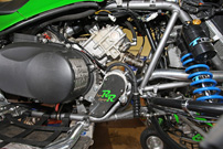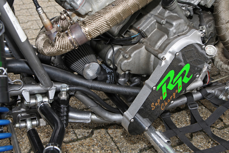 In der Kompressor KFX 700 des Kawasaki Tuning-Gurus aus Ziering arbeitet ein Gerät von Rotrex, das über ein Trijekt-Steuergerät befehligt wird. Abgesehen von 0,3 mm kürzeren Kolben, mit denen die Verdichtung von 9,9:1 (Original) auf 8,9:1 reduziert wird, bleibt der 700er Kawasaki-Zweizylinder in der Kompressor KFX 700 original. Gripsgymnastik erforderten vor allem die Flansche, über welche die Einspritzdüsen mit dem Motor verbunden werden. „Die mussten wir konstruieren und fräsen“, berichtet Florian.