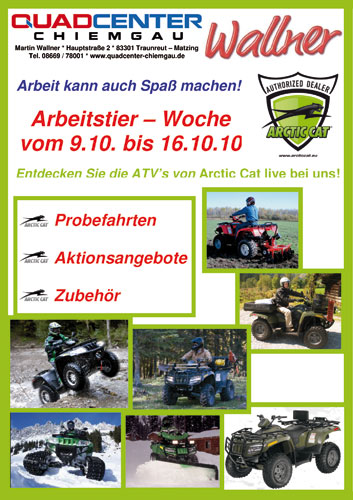 „Arbeit kann auch Spaß machen“, behauptet Martin Wallner vom Quadcenter Chiemgau und gibt allen, die da irgendwelche Zweifel hegen, im Rahmen seiner ‚Arbeitstier-Woche‘ die Möglichkeit, lästige alte Glaubenssätze über Bord zu werfen: Vom 8. bis 16. Oktober präsentiert der Arctic-Cat-Händler in Traunreut Matzing die Fahrzeuge – insbesondere das dieselbetriebene ATV – des amerikanischen Herstellers, ebenso Utility-Zubehör dafür, und nicht zuletzt lockt er mit Aktions-Angeboten. Arbeiten gibt´s schließlich genug, bei denen eine Arctic Cat wertvolle Unterstützung leisten kann. Allen voran bei