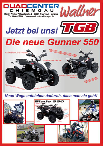 Und wer überdies noch Zeit für (Fahr-) Spaß hat, findet bei Quadcenter Chiemgau auch die neue TGB Gunner 550 sowie alle weiteren aktuellen Fahrzeuge des taiwanesischen Quad-Herstellers. Denn „neue Wege entstehen dadurch, dass man sie geht“, behauptet Martin Wallner.