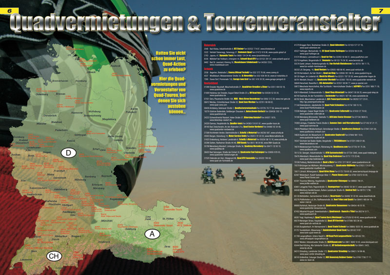Unsere Übersicht über Quadvermietungen und Tourenveranstalter in Deutschland, Österreich und der Schweiz haben wir weiterentwickelt und präsentieren auf Seite 6 und 7 auf einer Landkarte des deutschsprachigen Raums 68 Unternehmen, bei denen vom ersten ‚Gehversuch‘ mit dem Krabbelzeug bis hin zum Hardcore-Event im extremen Offroad vielfältiger Quadfahrspaß angesagt ist…