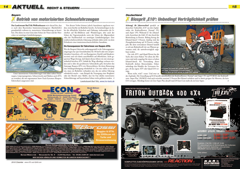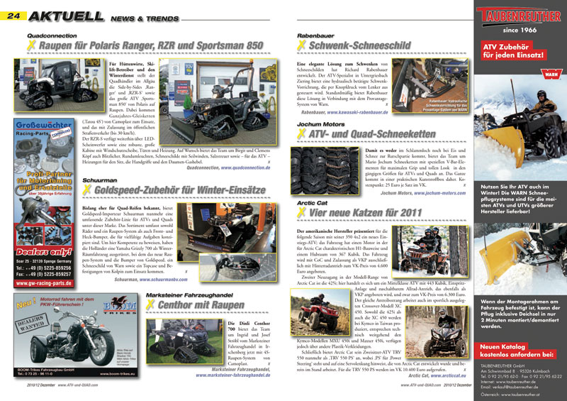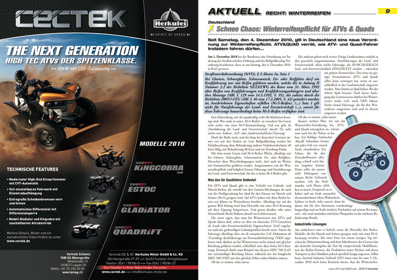 …erscheint am 31. Dezember 2010. Passend zur Jahreszeit steht der Winter im Mittelpunkt: Klarheit in Sachen Winterreifen-Pflicht für ATVs und Quads, Zulassungen für Raupen-Kits, Aktuelles über Fahrzeuge, Ausrüstung und Zubehör für den Winter und eine Marktübersicht über ATV- und UTV-Umbauten für die Bergwacht. Außerdem hat der Weihnachtsmann höchstpersönlich eine Triton Outback 400 4×4 getestet…