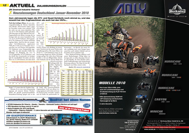 Nach dem kräftigen Minus, das uns zulassungszahlenmäßig die Monate September und Oktober 2010 beschert haben, ging’s im November wieder etwas aufwärts: Zum Jahresende legen die ATV- und Quad-Verkäufe noch einmal zu, und das sowohl bei den Zugmaschinen als auch bei den VKPs… auf Seite 12