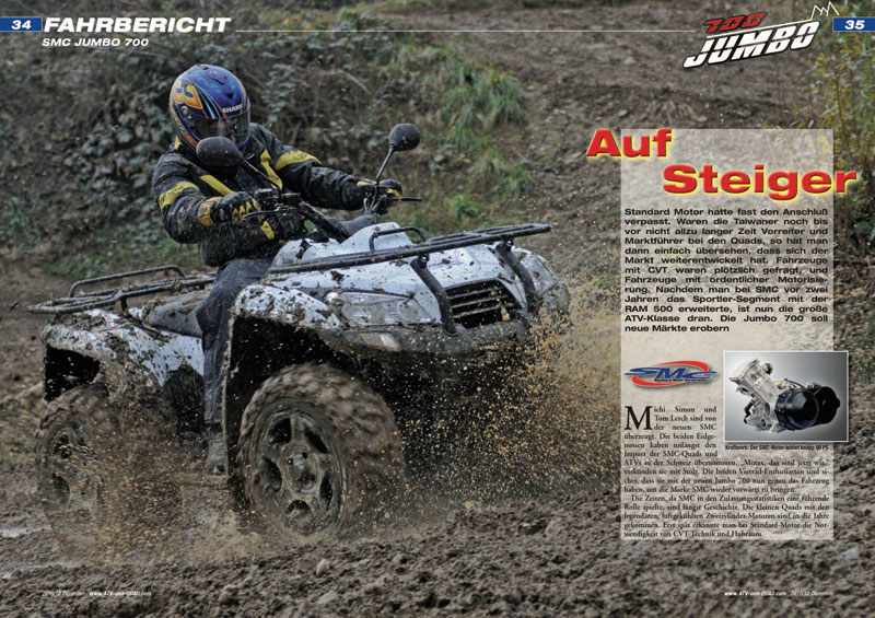 Standard Motor hatte fast den Anschluß verpasst. Waren die Taiwaner noch bis vor nicht allzu langer Zeit Vorreiter und Marktführer bei den Quads, so hat man dann einfach übersehen, dass sich der Markt weiterentwickelt hat. Fahrzeuge mit CVT waren plötzlich gefragt, und Fahrzeuge mit ordentlicher Motorisierung. Nachdem man bei SMC vor zwei Jahren das Sportler-Segment mit der RAM 500 erweiterte, ist nun die große ATV-Klasse dran. Die Jumbo 700 soll neue Märkte erobern… Ab Seite 34