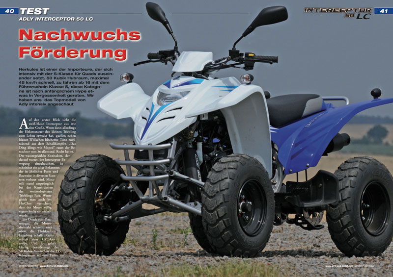 Herkules ist einer der Importeure, der sich intensiv mit der S-Klasse für Quads auseinander setzt. 50 Kubik Hubraum, maximal 45 km/h schnell, zu fahren ab 16 mit dem Führerschein Klasse S, diese Kategorie ist nach anfänglichem Hype etwas in Vergessenheit geraten. Wir haben uns das Topmodell von Adly intensiv angeschaut… Seite 40