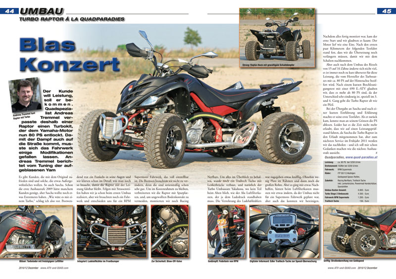 Der Kunde will Leistung, soll er bekommen. Quadspezialist Andreas Tremmel verpasst deshalb einer Raptor einen Turbokit, der dem Yamaha-Motor nun 80 PS entlockt. Damit der Dampf auch die Straße kommt, musste sich das Fahrwerk einige Modifikationen gepfallen lassen. Andreas Tremmel berichtet vom Tuning der aufgeblasenen Yam… Seite 44