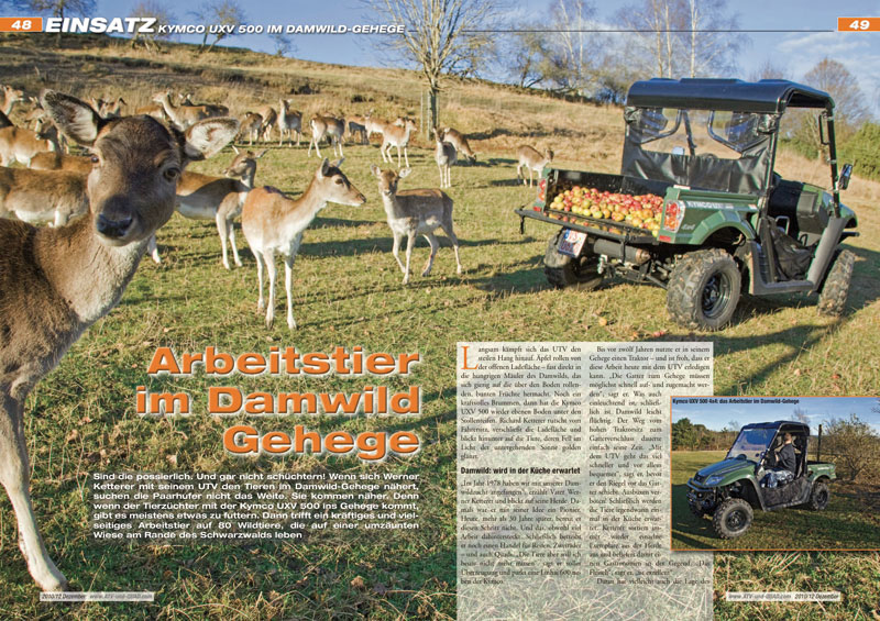 Sind die possierlich. Und gar nicht schüchtern! Wenn sich Werner Ketterer mit seinem UTV den Tieren im Damwild-Gehege nähert, suchen die Paarhufer nicht das Weite. Sie kommen näher. Denn wenn der Tierzüchter mit der Kymco UXV 500 ins Gehege kommt, gibt es meistens etwas zu futtern. Dann trifft ein kräftiges und vielseitiges Arbeitstier auf 80 Wildtiere, die auf einer umzäunten Wiese am Rande des Schwarzwalds leben… Seite 48