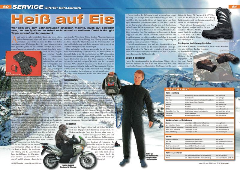 Heiß auf Eis: Wer sein ATV zum Schneeräumen einsetzen möchte, muss gut bekleidet sein, um den Spaß an der Arbeit nicht schnell zu verlieren. Dietrich Hub gibt Tipps, worauf es hier ankommt. Außerdem enthält der Beitrag eine Übersicht über die besten Anbieter von Heizbekleidung, Lenkerstulpen und ATV-tauglichen Winter-Stiefeln… Seite 60