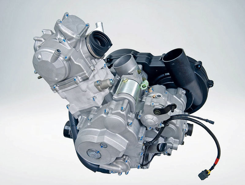 - Motor: flüssigkeitsgekühlter 1-Zylinder 4-Takt Motor mit 4 Ventilen je Zylinder