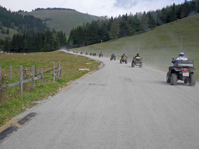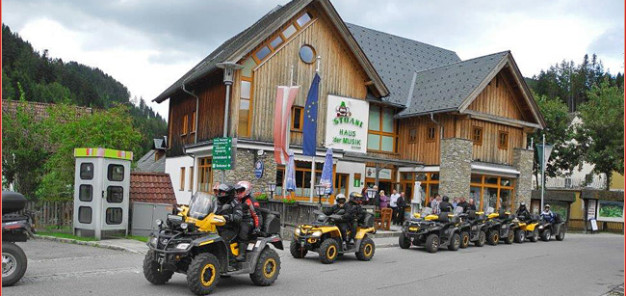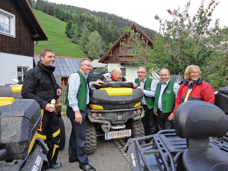Zur Allrad Horn Herbst Ausfahrt 2013 hatte der Can-Am-Vertragshändler in Möderbrugg in der Ober-Steiermark am Samstag, den 21. September, Freunde und Kunden eingeladen. Trotz anfänglich nasser Witterung folgten 19 Quad-Fahrer der Einladung, mit Beifahrerinnen eine Gruppe von immerhin 28 Personen. Um 9 Uhr begann die Tour, es ging auf Schotterwegen über das Sommertörl in den Nachbarbezirk Knittelfeld nach Seckau. Nach einer kurzen Pause beim Hofwirt führte die Ausfahrt entlang dem Murtal abwärts bis nach Niklasdorf. Dort gab es nach einer kurzen Offroad-Passage auf der urigen ‚Lahner Huabn‘ eine erste Stärkung bzw. Aufwärmung.