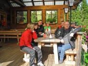 Nach diesem ausgedehnten Aufenthalt bei mittlerweile warmem und sonnigem Wetter führte die Rückfahrt über die Panorama-Straße herunter nach Gasen, der Heimat von ‚> Die Stoakogler < , einer steirischen Volksmusik-Gruppe, welche beim Aufenthalt beim > Stoani Haus < für gemeinsame Fotos zur Verfügung stand. Zurück auf der gleichen Strecke, wurde der Tross im Shoppingcenter LCS in Leoben erwartet: Semi, der Betreiber des Lokals Fellini im Shoppingcenter, ist begeisterter Can-Am-Fahrer und hatte die Teilnehmer zur letzten Rast auf der Allrad Horn Herbst Ausfahrt 2013 gerufen.