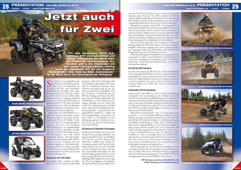 Jetzt auch für Zwei: Für das Modelljahr 2013 präsentiert BRP stärkere 500er und 650er Triebwerke für seine Can-Am Outlander und Renegade, außerdem gibt´s die Outlander mit den neuen G2-Fahrwerken künftig auch als Zweisitzer mit 20 cm längeren Radständen. Das Side-by-Side ‚Commander‘ ist ab 2013 auch mit Servolenkung verfügbar.