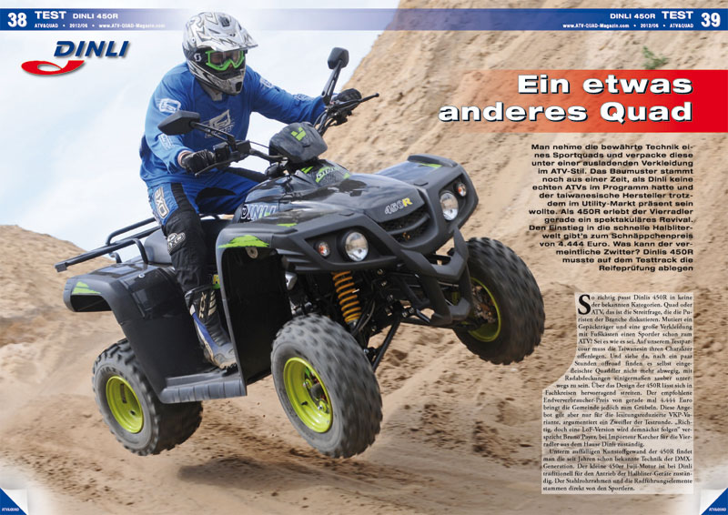 Ein etwas anderes Quad: Man nehme die bewährte Technik eines Sportquads und verpacke diese unter einer ausladenden Verkleidung im ATV-Stil. Das Baumuster stammt noch aus einer Zeit, als Dinli keine echten ATVs im Programm hatte und der taiwanesische Hersteller trotzdem im Utility-Markt präsent sein wollte. Als 450R erlebt der Vierradler gerade ein spektakuläres Revival. Den Einstieg in die schnelle Halbliterwelt gibt’s zum Schnäppchenpreis von 4.444 Euro. Was kann der vermeintliche Zwitter? Dinlis 450R musste auf dem Testtrack die Reifeprüfung ablegen.