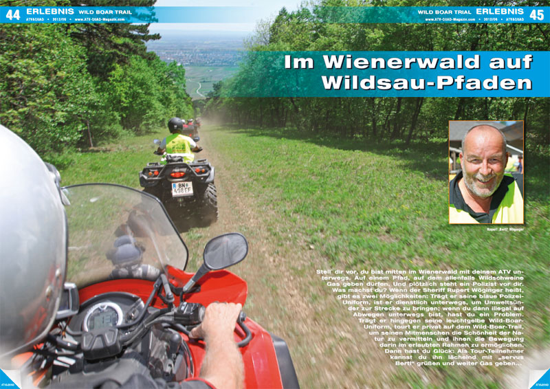 Wienerwald auf Wildsau-Pfaden: Stell´ dir vor, du bist mitten im Wienerwald mit deinem ATV unterwegs. Auf einem Pfad, auf dem allenfalls Wildschweine Gas geben dürfen. Und plötzlich steht ein Polizist vor dir. Was machst du? Wenn der Sheriff Rupert Wöginger heißt, gibt es zwei Möglichkeiten: Trägt er seine blaue Polizei-Uniform, ist er dienstlich unterwegs, um Umweltsünder zur Strecke zu bringen; wenn du dann illegal auf Abwegen unterwegs bist, hast du ein Problem. Trägt er hingegen seine leuchtgelbe Wild-Boar-Uniform, tourt er privat auf dem Wild-Boar-Trail, um seinen Mitmenschen die Schönheit der Natur zu vermitteln und ihnen die Bewegung darin im erlaubten Rahmen zu ermöglichen. Dann hast du Glück: Als Tour-Teilnehmer kannst du ihn lächelnd mit „servus Bertl“ grüßen und weiter Gas geben…