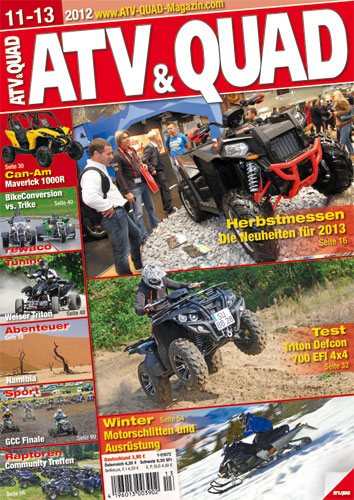 Die Ausgabe ATV&QUAD 2012/11-12 ist ab 7. November 2012 am Kiosk. Im Mittelpunkt steht der 1. Teil der Messe-Neuheiten für 2013, ein Test der brandneuen Triton Defcon 700 EFI 4×4 sowie der Vergleich einer Bike-Conversion von Rewaco mit einem klassischen Trike. Präsentiert werden die Can-Am Maverick 1000R sowie die Motorschlitten-Range von Yamaha für den kommenden Winter 2012/2013. Den getunten Triton-PIMP von Andre Weiser zeigen wir auf dem Poster im Mittelaufschlag, außerdem berichten wir über die Daniela Buchers Quad-Abenteuer in der Wüste Namib, die Herbst-Ausfahrt der Raptoren-Community und das diesjährige Sauerland-Treffen.