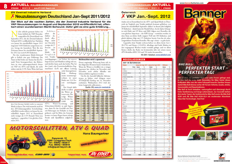 Januar bis September 2011 / 2012: Geht es nach den nackten Zahlen, wurden von Januar bis August MEHR VKPs zugelassen als von Januar bis September – der Blick auf die Zahlen, die der Zweirad Industrie Verband für die VKP-Neuzulassungen im August und September 2012 veröffentlicht hat, offenbart also einen wundersamen Markt-Schwund. Doch dafür gibt es eine gute Erklärung. Zu finden in ATV&QUAD 2012/11-12 auf Seite 8…