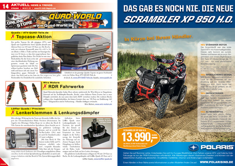 News & Trends, Austria X Team / Werbetechnik Truckenthanner: Individuelle Decor-Kits; XRW Racing Performance: Überroll-Käfig für Polaris RZR, JSS-Automotive: H&R-Stabilisator für E.-ATV; Quadix / ATV-QUAD-Teile.de: Topcase-Aktion; Wirz Motors: RDR Fahrwerke; Löffler Quads: Precision Lenkerklemmen und Lenkungsdämpfer