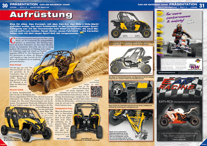 Aufrüstung: Eine für alles. Das Konzept, mit dem Can-Am den Side-x-Side-Markt aufrollen wollte, hat nicht funktioniert. In der prestigeträchtigen Sport-Kategorie war mit der Commander kein Staat zu machen, die neue Maverick soll’s nun richten. Neuer Motor, neues Fahrwerk – die Kanadier haben sich mit dem neuen Sport-SxS viel vorgenommen. Seite 30.