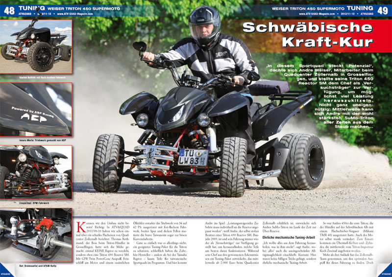 Schwäbische Kraft-Kur: ‚In diesem Sportquad steckt Potenzial‘, dachte sich Andre Weiser, Mitarbeiter beim Quadcenter Zollernalb in Grosselfingen, und stellte seine Triton 450 Reactor SM dem Chef als ‚Versuchsträger‘ zur Verfügung, um möglichst viel Leistung herauszukitzeln. Nicht ganz uneigennützig: Mittlerweile kann sich Andre mit der wohl stärksten SuMo-Triton aller Zeiten aus dem Staub machen…