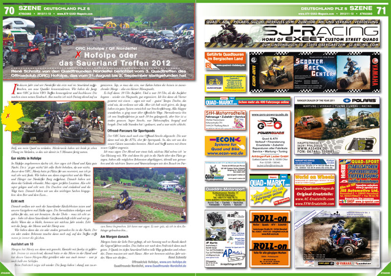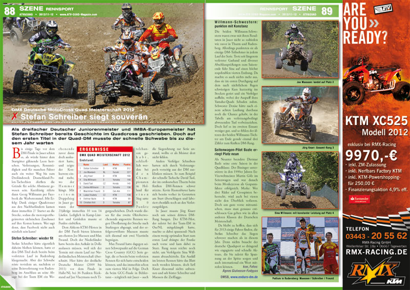 DMX Deutsche MotoCross Quad Meisterschaft 2012: Stefan Schreiber siegt souverän; GCC German Cross Country 2012: Wechselbad mit Fango-Einlagen; Int. Quad & ATV Schnee SpeedWay Cup: Vollgas mit 3 neuen Locations; ab Seite 88…