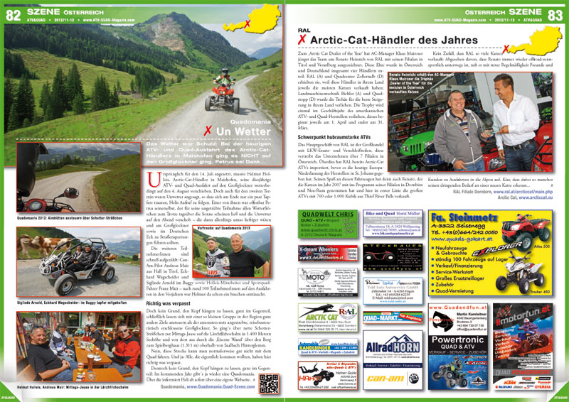 Quadomania 2012: Un Wetter; RAL: Arctic-Cat-Händler des Jahres; Austrian SuperMoto Quad Masters: Turbulente aber gelungene Premiere. Ab Seite 82…