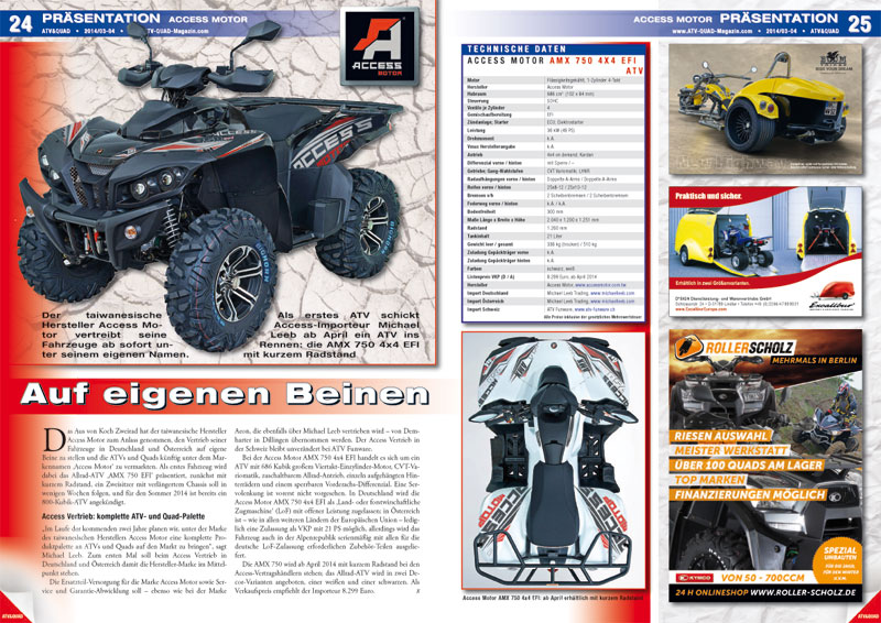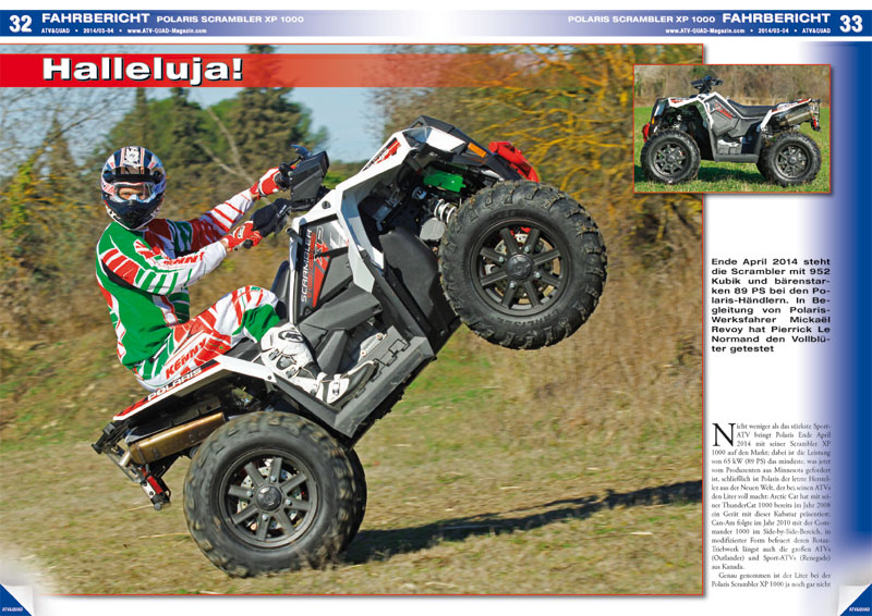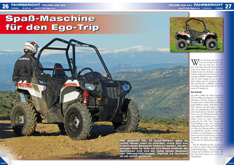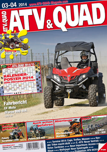 Als erste deutschsprachige Fachzeitschrift gibt´s in ATV&QUAD Magazin 2014/03-04 die Fahrberichte von zwei Fahrzeugen zu lesen, die es in Deutschland noch gar nicht zum Fahren gibt: der Polaris Sportsman ACE 4×4 und der Scramber 1000. Außerdem ein Fahrbericht der brandneuen CF Moto ZForce 800 EX als Side-by-Side-Schwester des bekannten ATVs Terralander 800 4×4.