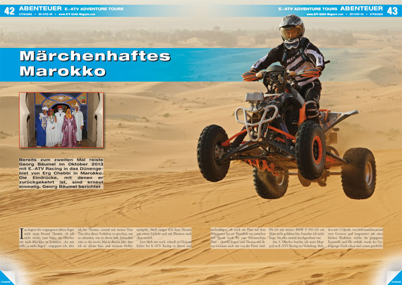 Bereits zum zweiten Mal reiste Gerog Bäumel im Oktober 2013 mit E.-ATV Racing in das Dünengebiet von Erg Chebbi in Marokko. Die Eindrücke, mit denen er zurückgekehrt ist, sind erneut einmalig. Georgs Bericht ist zu lesen in ATV&QUAD Magazin 2014/03-04 ab Seite 42.