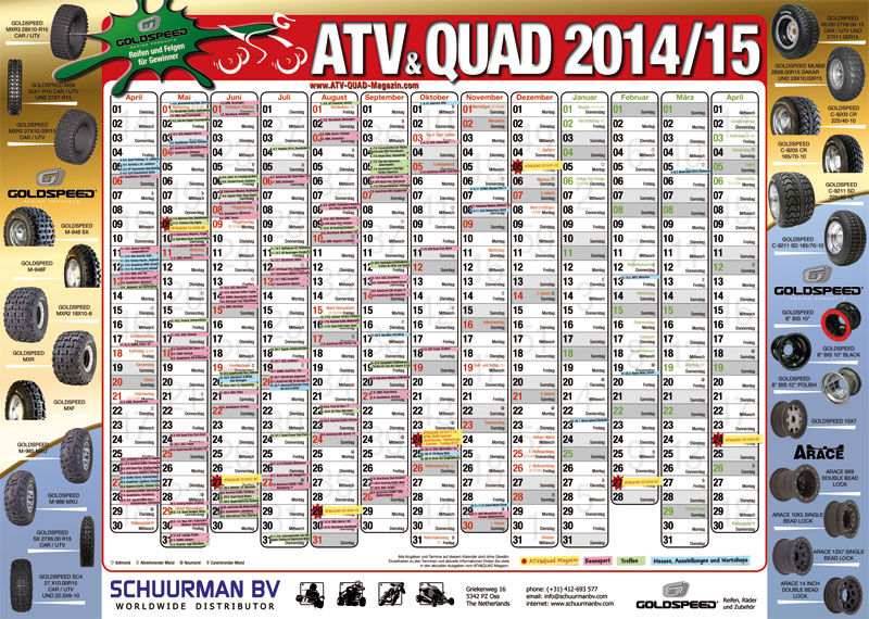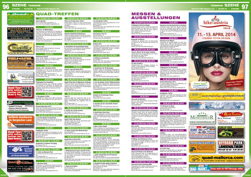 Zum Herausnehmen im Mittelaufschlag von ATV&QUAD Magazin 2014/03-04 gibt´s – traditionsgemäß in der ATV&QUAD-Saisonstart-Ausgabe – ein gigantisches Kalenderposter im Din-A-0-Format mit den wichtigsten Terminen der ATV&QUAD-Szene von April 2014 bis März 2015: Quad-Treffen, Cups & Meisterschaften, Messen & Ausstellungen.