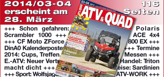 ATV&QUAD Magazin 2014/03-04 erscheint am am Freitag, den 28. März 2014, und das mit nicht weniger als 82 Beiträgen. Unter diesen die Fahrberichte von zwei Fahrzeugen, die es in Deutschland noch gar nicht zum Fahren gibt. Zu den Highlights der Saisonstart-Ausgabe von ATV&QUAD zählt traditionell auch das Kalender-Poster im Din-A-0-Format mit den wichtigsten ATV&QUAD-Terminen von April 2014 bis März 2015.