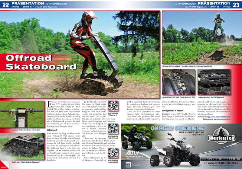 Mit dem DTV Shredder kommt ein neues Spaß-Mobil auf uns zu. Im Zentrum stehen dabei zwei Raupenketten, die mit den Füßen gelenkt werden – gewissermaßen ein Offroad Skateboard also. Wir sind das Teil bereits gefahren: Wie es sich ‚skatet‘ und was man mit dem rund 6.000 Euro teuren Spaßmacher alles anstellen kann, verrät unser Beitrag in ATV&QUAD Magazin 2014/05-06.