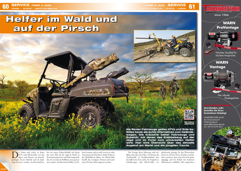Helfer im Wald und auf der Pirsch: Als Revier-Fahrzeuge gelten ATVs und Side-by-Sides heute als echte Alternativen zum Geländewagen. Die Industrie bietet Fahrzeuge und Zubehör, mit denen das Krabbelzeug auf der Jagd und im Forst zum universellen Helfer wird. In ATV&QUAD Magazin 2014/05-06 eine Übersicht über das aktuelle Angebot am Markt, die jüngsten Trends und eine Marktübersicht mit den wichtigsten 44 Anbietern von Zubehör für Jäger und Förster.
