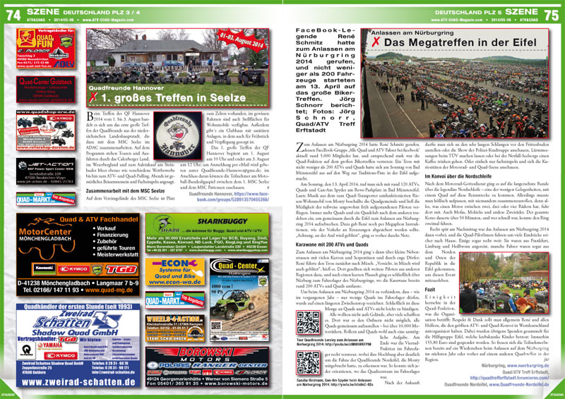 Das Megatreffen in der Eifel: FaceBook-Legende René Schmitz hatte zum Anlassen am Nürburgring 2014 gerufen, und nicht weniger als 200 Fahrzeuge starteten am 13. April auf das große Biker-Treffen. Jörg Schnorr berichtet in ATV&QUAD Magazin 2014/05-06.