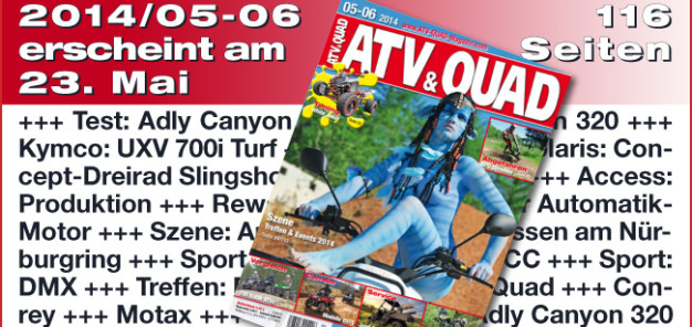 ATV&QUAD Magazin 2014/05-06 erscheint am am Freitag, den 23. Mai 2014, und das Warten hat sich einmal wieder gelohnt: Die neue Ausgabe enthält nicht weniger als 81 Beiträge, darunter drei Tests, fünf Präsentationen, eine Marktübersicht und zwei toll bebilderte Berichte über Umbauten. Obendrein – wie gewohnt – zig Termine von Cups & Meisterschaften, Messen & Ausstellungen sowie Quadtreffen in den kommenden Monaten.