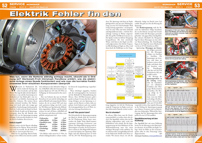 Elektrik Fehler finden. Was tun, wenn die Batterie ständig schlapp macht, obwohl sie in Ordnung ist? Werkstatt-Profi Christoph Pandikow erklärt im ‚Workshop‘, wie die elektrische Anlage eines Quads funktioniert und wie man die korrekte Funktionsweise ihrer Komponenten überprüft.