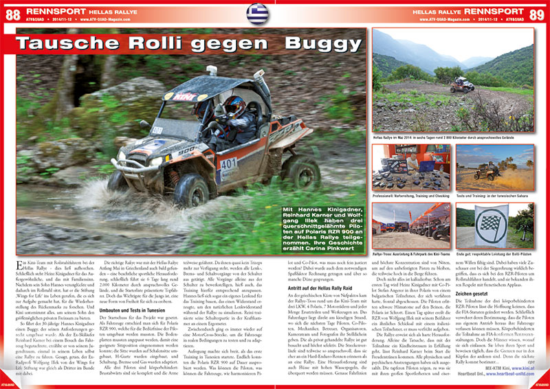 Mit Hannes Kinigadner, Reinhard Karner und Wolfgang lllek haben drei querschnittgelähmte Piloten auf Polaris RZR 900 an der Hellas Rallye teilgenommen. Ihre Geschichte erzählt Carina Pinkwart. Außerdem in der Rubrik ‚Rennsport‘: die Absage des Schnee SpeedWay Cup 2015, die Termine der BHV Alpen Challenge als neuer Herausforderung für Winter-Piloten, der EM Endurance Masters 2015 und der GCC German Cross Country 2015.