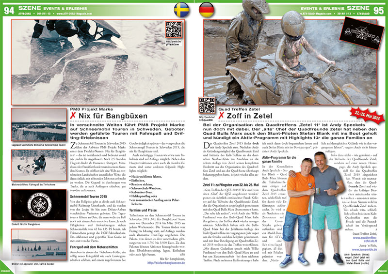 Was los ist in der Szene, bei welchen Händler es Veränderungen gibt und welche Treffen im kommenden Jahr geplant sind, findet sich in der Rubrik ‚Szene‘. Zu den Highlights zählen die Reportage über das Gelände-Abenteuer im Offroad-Park Saverne, zu dem das QJC-PowerSportCenter am 11. Oktober eingeladen hatte, sowie die Offroad-Hatz bei Tag & Nacht auf dem Offroad-Abenteuer in Hottingen am 6. und 7. September. Außerdem Berichte über die Weihnachtsgaudi 2014 in Ruhla, bei welcher die Mannen von Quad-TH einmal wieder den Weihnachtsmann auf ihren ATVs und Quads abholen, und über das diesjährige Treffen der Quad/ATV Freunde Amberg Sulzbach.
