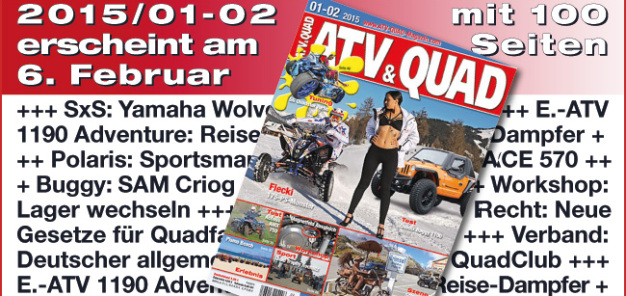 Der Winterschlaf hat gar nicht stattgefunden, und so erscheint ATV&QUAD Magazin 2015/01-02 mitten im Winter am 6. Februar 2015. Dabei ist die neue Ausgabe einmal wieder prall gefüllt mit aktuellem, interessantem Inhalt.