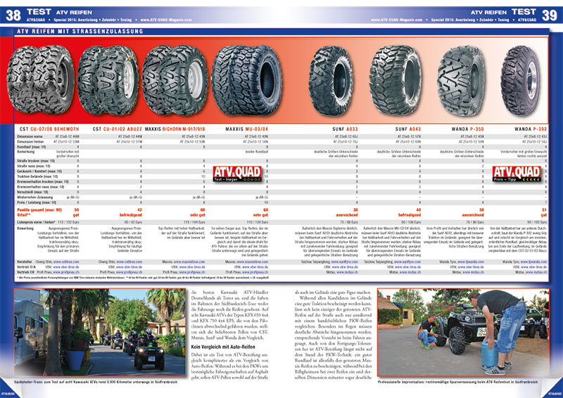 Der war wohl fällig: ein Vergleich der beliebtesten ATV-Reifen mit Straßenzulassung. Lässt sich mit den Billigen Geld sparen? Wie viel besser sind die Premium-Pellen? Wie gut sind ATV-Reifen überhaupt im Vergleich zu PKW-Bereifung? Zur Beantwortung dieser Fragen einmal keine Stammtisch-Parolen. Vielmehr hat das Sacksteder-Team acht verschiedene Reifen-Typen auf Kawasaki ATVs montiert und ist mit den Fahrzeugen zeitgleich rund 3.000 Kilometer durch Südfrankreich getourt. Die Piloten haben die Fahrzeuge untereinander getauscht, so dass den Vergleich für ein ausgewogenes Urteil hatte. Zum Ergebnis ab Seite 36…