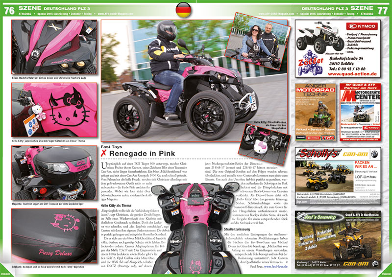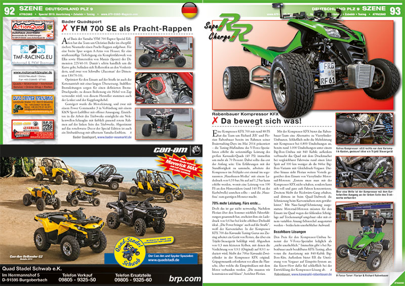 Mit dem ATV&QUAD Special 2015 ist am 30. Oktober 2014 zum zweiten Mal ein Nachschlagewerk für Ausrüstung, Zubehör und Tuning in Sachen ATVs, Quads und Side-by-Sides erschienen. Im Mittelpunkt stehen Tipps und Marktübersichten über das Angebot an Ausrüstung & Bekleidung, Arbeit & Einsatz, Anhänger, Ersatz- & Verschleißteile, Performance & Tuning sowie PIMPs & Umbauten. Außerdem haben sich in einem großen Test acht straßenzugelassene ATV-Reifen dem Vergleich gestellt. Präsentationen der 2015er Yamaha YFM 700R ‚Raptor‘, der Can-Am Maverick X ds Turbo sowie der Modelle 2015 von Arctic Cat und Kymco runden das ATV&QUAD Special 2015 ebenso ab wir der aktuelle PIMP ‚Kawasanne‘ und eine pinke Can-Am Renegade 1000.