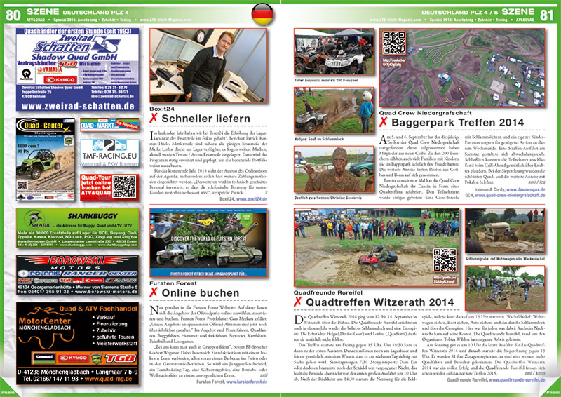 ATV&QUAD Special 2015 gibt´s für 4,20 Euro im gut sortierten Zeitschriften-Handel und bei folgenden > Quad-Händlern < . x