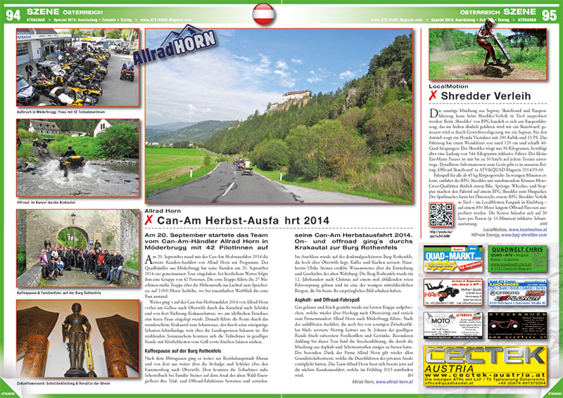 Am 20. September startete das Team vom Can-Am-Händler Allrad Horn in Möderbrugg mit 42 PilotInnen auf seine Can-Am Herbstausfahrt 2014. On- und offroad ging´s durchs Krakautal zur Burg Rothenfels. Das Mühlviertler Quadtreffen 2014 hat dieses Jahr bereits am 29. Juni stattgefunden. Aufgrund der wachsenden Teilnehmerzahl wurde der Veranstaltungsort gewechselt, und den Pokal für den ältesten Teilnehmer mussten sich ZWEI Achtzigjährige teilen, die beide am selben Tag Geburtstag haben.